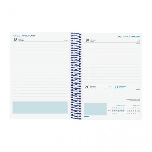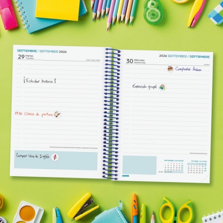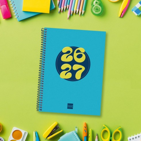 Agenda para estudiantes orientada a la organización del curso lectivo. Espiral simple metálica y tapas de cartón forrado. Con esquinas microperforadas para localizar rápidamente el día/semana en curso. La anualidad contiene la información útil relativa a: onomástica, festivos nacionales, cambios de estación, información sobre días mundiales de interés y días señalados como el día de la madre, el día del padre, carnaval, etc. La agenda incluye otros contenidos extra útiles y prácticos.