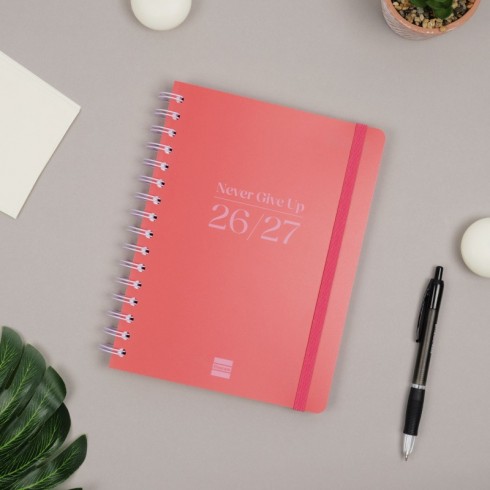Agenda de curso escolar para estudiantes y adultos que se organizan de septiembre a agosto. Espiral doble metálica y tapas ligeras de polipropileno reciclado, procedente de residuos y polución del mar. Cierre con goma elástica.