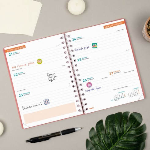 Con un formato similar a DIN A5, combina la portabilidad de una agenda de bolsillo con la funcionalidad de una de sobremesa.