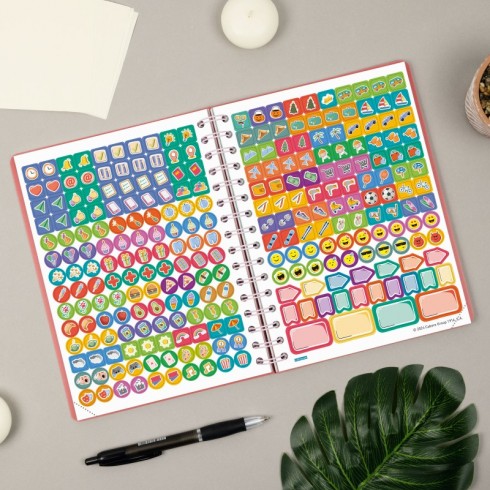 - Contenido: La anualidad de la agenda incluye la información relativa a: onomástica, festivos nacionales, cambios de estación, días mundiales e internacionales y días señalados. Contiene planificación mensual cuadriculada intercalada en la anualidad La agenda dispone de otros contenidos extra: datos personales, calendarios, planificación anual en columnas, horarios (3 trimestres), apartado para libros/películas/series, control de notas, inglés (verbos irregulares, adverbios, preposiciones, "phrasal verbs" y "false friends"), matemáticas (geometría, áreas visuales y volúmenes), tabla periódica, hojas de ausencias y retrasos y de solicitud de entrevistas, contactos y hojas tipo dotted y blancas. Y también pegatinas temáticas.