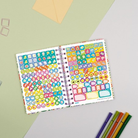 - Contenido: La anualidad de la agenda incluye la información relativa a: onomástica, festivos nacionales, cambios de estación, días mundiales e internacionales y días señalados. Contiene planificación mensual cuadriculada intercalada en la anualidad La agenda dispone de otros contenidos extra: datos personales, calendarios, planificación anual en columnas, horarios (3 trimestres), apartado para libros/películas/series, control de notas, inglés (verbos irregulares, adverbios, preposiciones, "phrasal verbs" y "false friends"), matemáticas (geometría, áreas visuales y volúmenes), tabla periódica, hojas de ausencias y retrasos y de solicitud de entrevistas, contactos y hojas tipo dotted y blancas. Y también pegatinas temáticas.