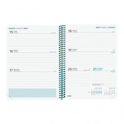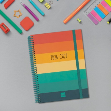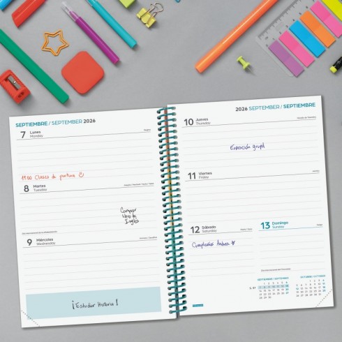 Agenda para estudiantes de secundaria orientada a la organización del curso lectivo. Espiral de plástico y tapas de cartón forrado. Las esquinas son microperforadas para localizar rápidamente el día/semana en curso. Agenda con información de interés en la anualidad y otros contenidos extra útiles y prácticos.