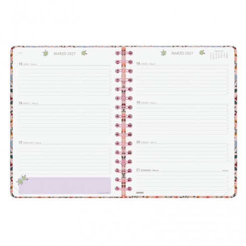 Agenda de tapa dura de cartón forrado con peliculado mate antirrayaduras. Con espiral doble, goma elástica y esquinas microperforadas para localizar rápidamente el día/semana en curso. Esta agenda se ha creado en colaboración con la diseñadora e ilustradora Moniquilla,
