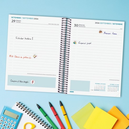 Incluye pegatinas temáticas para personalizar tu experiencia de organización y las esquinas microperforadas te permiten localizar rápidamente el día o semana en curso. Además, encontrarás información útil sobre el año escolar y otros contenidos prácticos.