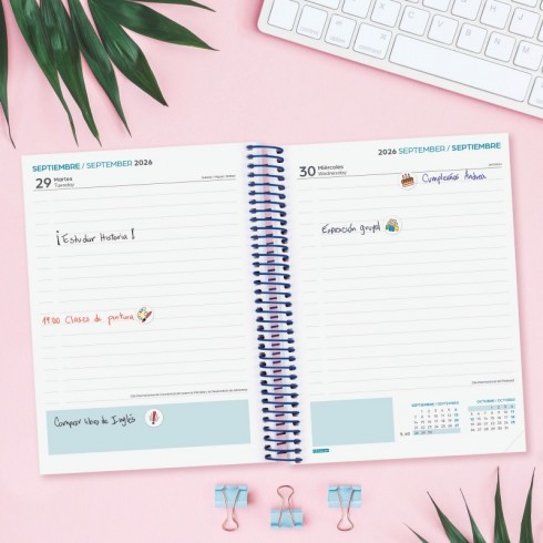 - Contenido: La anualidad de la agenda incluye la información relativa a: onomástica, festivos nacionales, cambios de estación, días mundiales e internacionales y días señalados. La agenda dispone también de otros contenidos extra: datos personales, calendario del curso, horarios (3 trimestres), libros/películas/series, seguimiento de exámenes y trabajos, inglés (verbos irregulares, adverbios, preposiciones, "phrasal verbs" y "false friends"), matemáticas (geometría, áreas visuales y volúmenes), tabla periódica, ausencias y retrasos, solicitud de entrevistas, contactos, hoja para anotaciones y dedicatorias y hojas tipo dotted, cuadriculadas y blancas. Y también pegatinas temáticas.