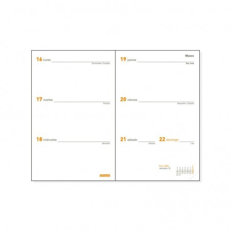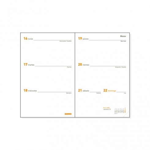 Recambio anual para agendas encuadernadas de bolsillo Finocam Plana. Con esquinas microperforadas para localizar rápidamente el día/semana en curso. La anualidad contiene los festivos nacionales y la onomástica.