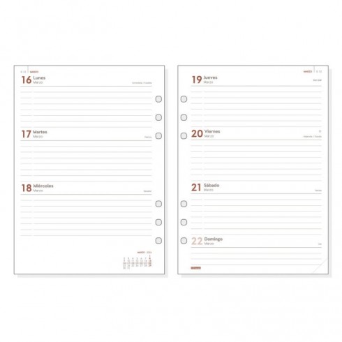 Recambio anual para agendas de anillas Finocam Open. 6 Taladros.