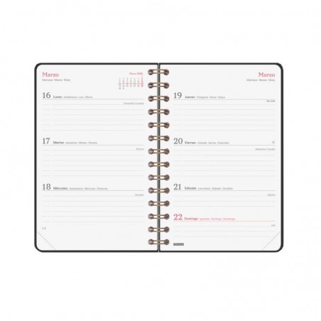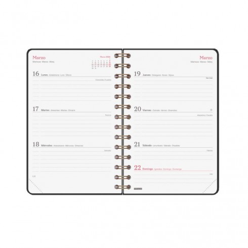 Agenda de espiral de tapa dura de cartón forrado con peliculado mate antirrayaduras y efecto soft touch. Diseño elegante y sofisticado con detalles estampados metalizados. Ideal para uso personal y/o profesional. Con goma elástica y esquinas microperforadas para localizar rápidamente el día/semana en curso.