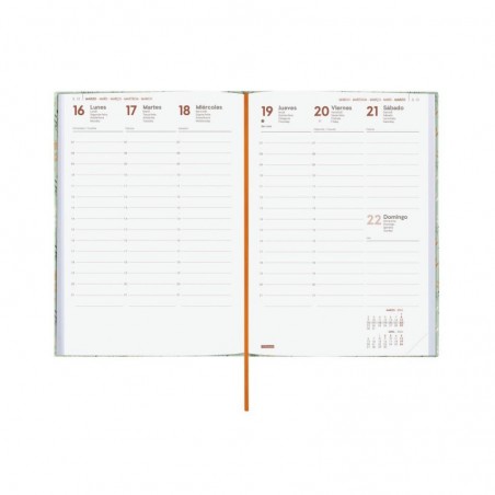 Agenda profesional encuadernada de estilo casual y actual. Tapa dura acolchada de cartón forrado con peliculado mate antirayaduras. Buena apertura. Con cinta-punto y goma elástica. La anualidad contiene la información útil relativa a: onomástica, fases lunares, festivos nacionales, cambios de estación, cambios de hora e inicios del nuevo año chino, musulmán, ortodoxo y hebreo. La agenda incluye otros contenidos extra.
