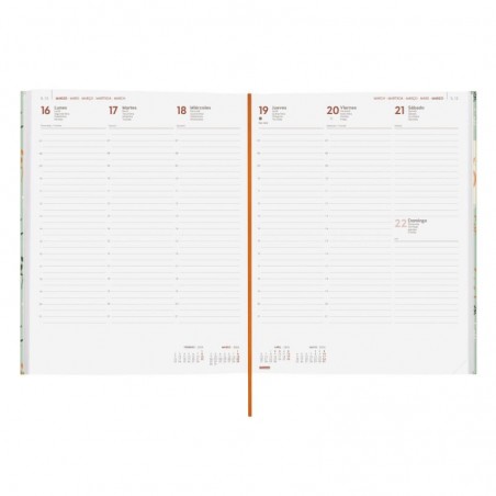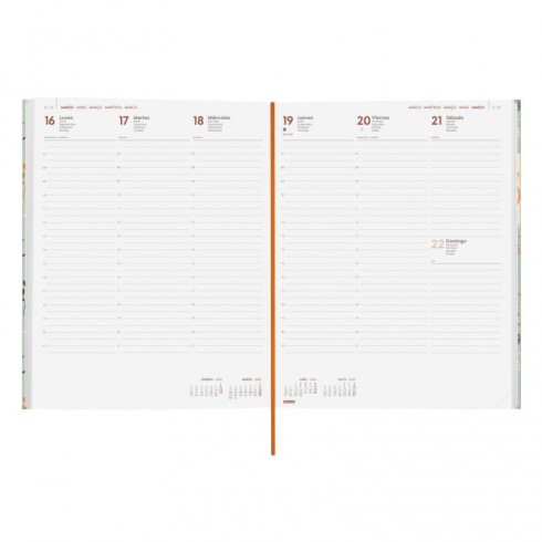 La tapa dura acolchada con acabado mate antirrayaduras y detalles estampados proporciona una estética premium, mientras que la encuadernación permite una apertura perfecta para escribir cómodamente. Incluye goma elástica, cinta punto y esquinas microperforadas para facilitar el uso diario.