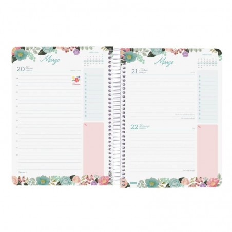 Agenda de espiral a todo color diseñada para acompañarte en todos los proyectos que quieras hacer florecer. De tapa dura de cartón forrado con peliculado mate antirrayaduras y goma elástica. Ideal tanto para estudiantes como para adultos. Al inicio de cada mes, la agenda ofrece el calendario cuadriculado acompañado de un mensaje motivador. Esquinas microperforadas para localizar rápidamente el día/semana en curso. La agenda dispone de adhesivos temáticos orientados a la organización personal, información de interés en la anualidad y otros contenidos extra. Disfruta de la planificación y la organización personal con esta agenda: cada día es una nueva oportunidad para hacer nacer y crecer tus objetivos.