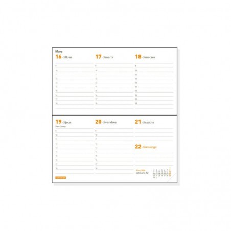 Agenda encuadernada de bolsillo muy ligera y práctica. Con cubierta de plástico transparente muy resistente al uso. Con esquinas microperforadas para localizar rápidamente el día/semana en curso. La anualidad contiene los festivos nacionales.