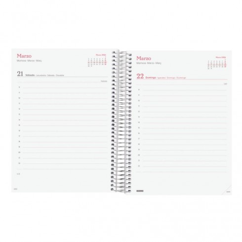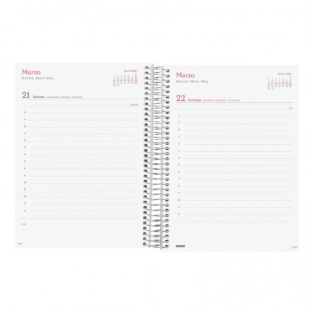 Agenda de espiral con tapas de polipropileno. Diseño en tendencia y a la moda. Ideal para uso personal y/o profesional. Con goma elástica. Con esquinas microperforadas para localizar rápidamente el día/semana en curso. La anualidad contiene la información útil relativa a: onomástica, festivos nacionales, cambios de estación y cambios de hora. La agenda incluye otros contenidos extra orientados a la organización personal. El diseño interior es limpio y fácil, con espacio suficiente para organizar tus proyectos, tareas y compromisos.
