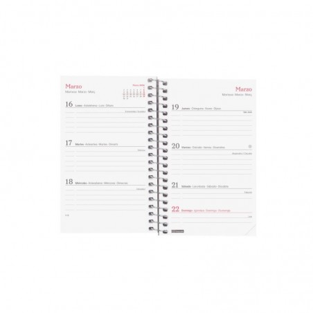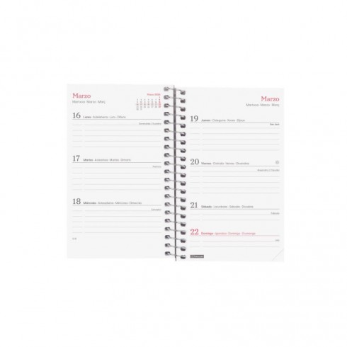 Agenda de espiral con tapas ligeras de polipropileno. Diseño en tendencia y a la moda. Ideal para uso personal y/o profesional. Con goma elástica. Con esquinas microperforadas para localizar rápidamente el día/semana en curso. El diseño interior es limpio y fácil, con espacio suficiente para organizar tus proyectos, tareas y compromisos. Agenda con información de interés en la anualidad y otros contenidos extra orientados a la organización personal.