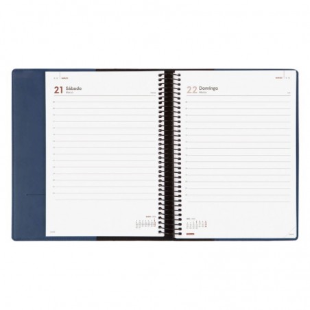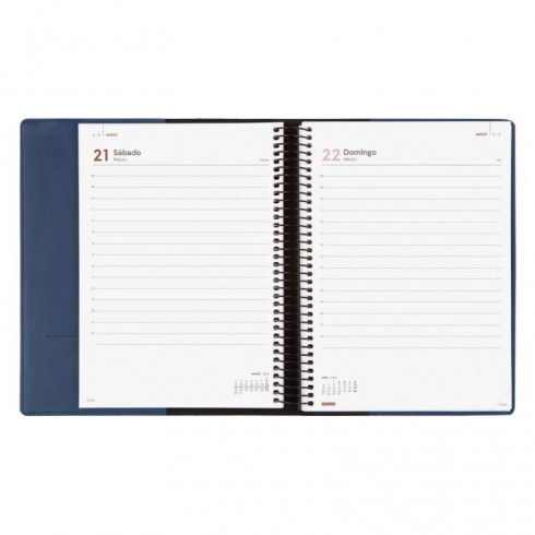 Agenda de espiral con cubierta. Diseño elegante y juvenil. Ideal para la oficina o para un uso personal. Con bolsillo interior. Equipada con un bloc de notas independiente para disponer siempre de hojas en blanco (también disponible como recambio). Cierre con goma elástica. Con esquinas microperforadas para localizar rápidamente el día/semana en curso. La anualidad contiene la información útil relativa a: onomástica, festivos nacionales, cambios de estación, cambios de hora e inicios del nuevo año chino, musulmán, ortodoxo y hebreo. La agenda incluye otros contenidos extra. Además, esta agenda te permite conservar la cubierta sustituyendo anualmente solo la agenda de espiral. Si lo deseas, también podrás reutilizar la cubierta como funda de libro o funda de libreta.