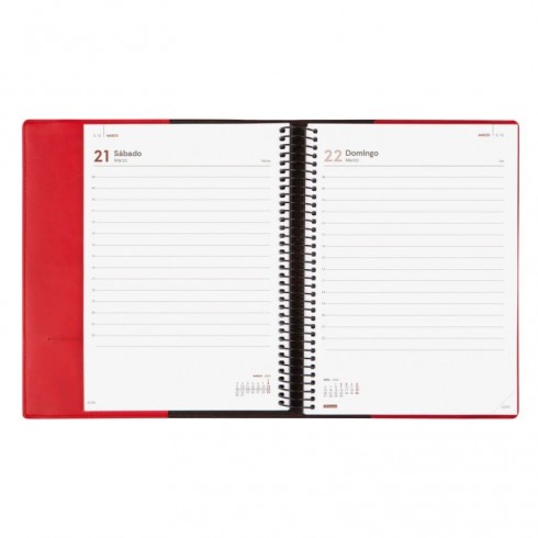 Agenda de espiral con cubierta. Diseño elegante y juvenil. Ideal para la oficina o para un uso personal. Con bolsillo interior. Equipada con un bloc de notas independiente para disponer siempre de hojas en blanco (también disponible como recambio). Cierre con goma elástica. Con esquinas microperforadas para localizar rápidamente el día/semana en curso. La anualidad contiene la información útil relativa a: onomástica, festivos nacionales, cambios de estación, cambios de hora e inicios del nuevo año chino, musulmán, ortodoxo y hebreo. La agenda incluye otros contenidos extra. Además, esta agenda te permite conservar la cubierta sustituyendo anualmente solo la agenda de espiral. Si lo deseas, también podrás reutilizar la cubierta como funda de libro o funda de libreta.