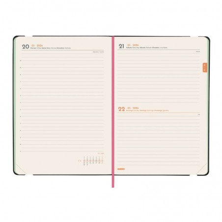 · Contenido: La anualidad de la agenda incluye la información relativa a la onomástica y a los festivos nacionales. La agenda dispone también de otros contenidos extra: datos personales, calendarios, horario, planificación anual en columnas, plan mensual cuadriculado, fechas para destacar, hojas para notas, hojas para checklist y hojas para teléfonos, direcciones y e-mails.