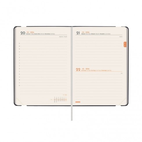 Agenda encuadernada de tapa blanda y flexible. Diseño moderno con carácter. Material de tacto suave y agradable. Apertura perfecta para poder escribir cómodamente. Con cinta punto y bolsillo interior con fuelle de papel-tejido muy resistente al uso. Con goma elástica y anilla portabolígrafo para llevar siempre contigo un elemento de escritura. Esquinas microperforadas para localizar rápidamente el día/semana en curso. Para facilitar la localización de cada mes, la anualidad incorpora un indicador en la parte superior de las páginas. La anualidad incluye información de interés y otros contenidos extra.