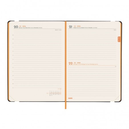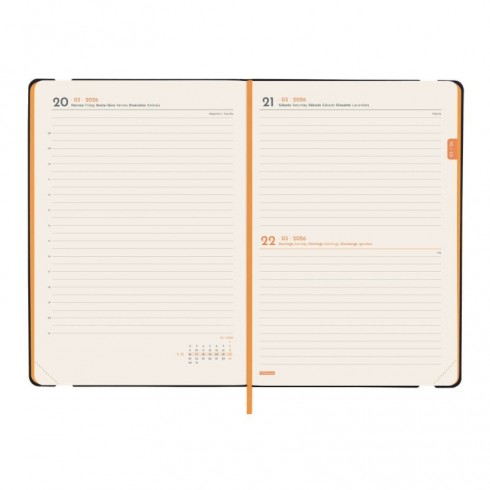 Agenda encuadernada de tapa blanda y flexible. Material de tacto suave y agradable. Apertura perfecta para poder escribir cómodamente. Con goma elástica y cinta punto. Esquinas microperforadas para localizar rápidamente el día/semana en curso. Para facilitar la localización de cada mes, la anualidad incorpora un indicador en la parte superior de las páginas. La anualidad incluye información de interés y otros contenidos extra.