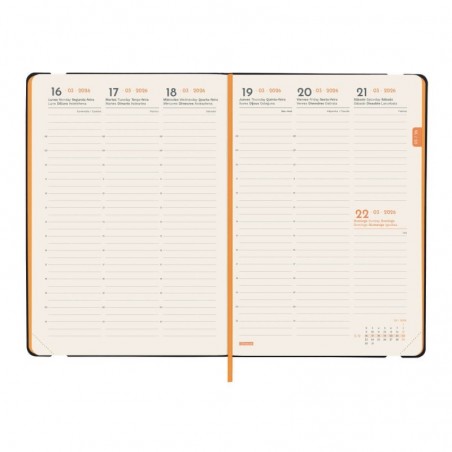 Agenda encuadernada de tapa blanda y flexible. Material de tacto suave y agradable. Apertura perfecta para poder escribir cómodamente. Con goma elástica y cinta punto. Esquinas microperforadas para localizar rápidamente el día/semana en curso. Para facilitar la localización de cada mes, la anualidad incorpora un indicador en la parte superior de las páginas. La anualidad incluye información de interés y otros contenidos extra.