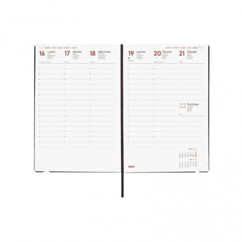 Agenda profesional encuadernada de tapa blanda y flexible. De tacto suave muy agradable. Estilo moderno y universal. Apertura perfecta para poder escribir cómodamente. Con goma elástica y cinta punto. Esquinas microperforadas para localizar rápidamente el día/semana en curso. Agenda con información de interés en la anualidad y otros contenidos extra.