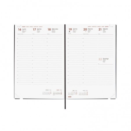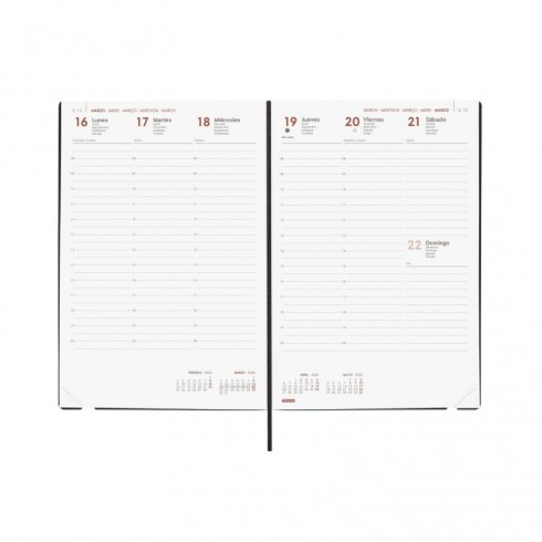 Agenda profesional encuadernada de tapa blanda y flexible. De tacto muy suave y gomoso. De estilo moderno y universal. Apertura perfecta. Con goma elástica y cinta-punto. Con esquinas microperforadas para localizar rápidamente el día/semana en curso. La anualidad contiene la información útil relativa a: onomástica, festivos nacionales, fases lunares, cambios de estación, cambios de hora e inicios del nuevo año chino, musulmán, ortodoxo y hebreo. La agenda incluye otros contenidos extra.