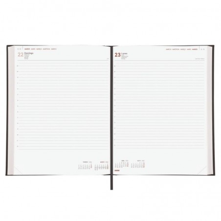 Agenda profesional encuadernada de estilo clásico y elegante. Tapa dura acolchada de polipiel. Buena apertura. Con cinta-punto. La anualidad contiene la información útil relativa a: onomástica, fases lunares, festivos nacionales, cambios de estación, cambios de hora e inicios del nuevo año chino, musulmán, ortodoxo y hebreo. La agenda incluye otros contenidos extra.
