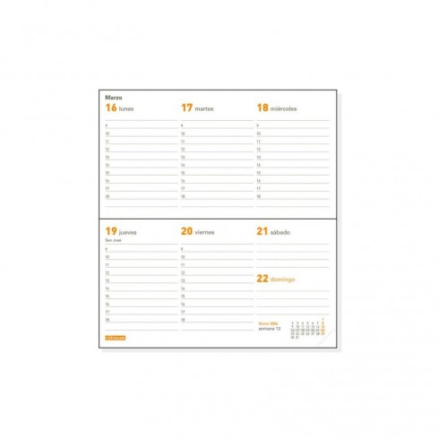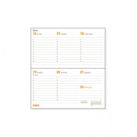 Agenda encuadernada de bolsillo muy ligera y práctica. Con cubierta de plástico transparente muy resistente al uso. Con esquinas microperforadas para localizar rápidamente el día/semana en curso. La anualidad contiene los festivos nacionales.