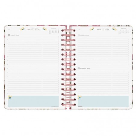 - Contenido: La anualidad de la agenda incluye: festivos nacionales, cambios de estación y días señalados. Contiene planificación mensual cuadriculada con las fases lunares intercalada en la anualidad. La agenda también dispone de otros contenidos extra: datos personales, calendarios, planificación anual en columnas, horarios, objetivos personales, planes, maleta, apartado para libros/películas/series/pódcast, hojas para anotaciones y tareas, contactos, adhesivos temáticos y dos marcapáginas.