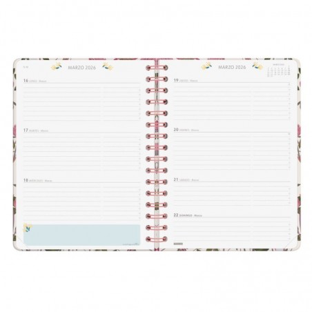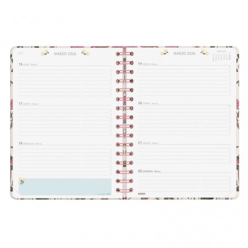 - Contenido: La anualidad de la agenda incluye: festivos nacionales, cambios de estación y días señalados. Contiene planificación mensual cuadriculada con las fases lunares intercalada en la anualidad. La agenda también dispone de otros contenidos extra: datos personales, calendarios, planificación anual en columnas, horarios, objetivos personales, planes, maleta, apartado para libros/películas/series/pódcast, hojas para anotaciones y tareas, contactos, adhesivos temáticos y dos marcapáginas.