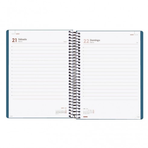 Agenda de espiral de estilo moderno y universal con tapa dura de cartón forrado con peliculado mate antirrayaduras. Con goma elástica. Ideal para uso personal y/o profesional. Esquinas microperforadas para localizar rápidamente el día/semana en curso. Agenda con información de interés en la anualidad y otros contenidos extra.
