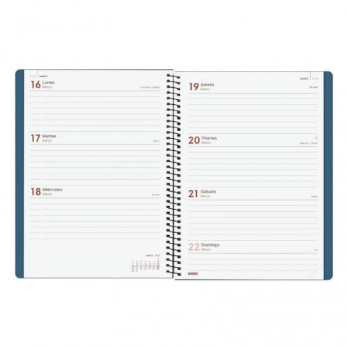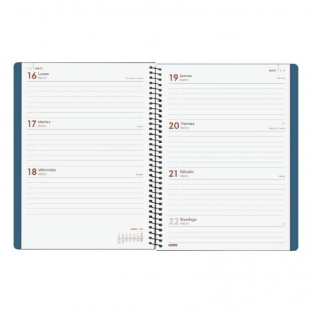 Agenda de espiral de estilo moderno y universal con tapa dura de cartón forrado con peliculado mate antirrayaduras. Con goma elástica. Ideal para uso personal y/o profesional. Esquinas microperforadas para localizar rápidamente el día/semana en curso. Agenda con información de interés en la anualidad y otros contenidos extra.