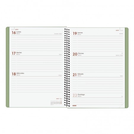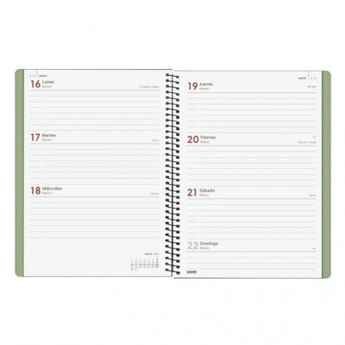 Agenda de espiral de estilo moderno y universal con tapa dura de cartón forrado con peliculado mate antirrayaduras. Con goma elástica. Ideal para uso personal y/o profesional. Esquinas microperforadas para localizar rápidamente el día/semana en curso. Agenda con información de interés en la anualidad y otros contenidos extra.