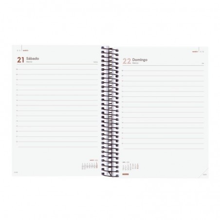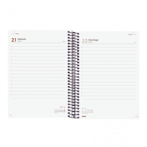 Agenda de espiral de estilo moderno y universal con tapas ligeras de polipropileno. Con goma elástica. Con esquinas microperforadas para localizar rápidamente el día/semana en curso. Agenda con información de interés en la anualidad y otros contenidos extra.