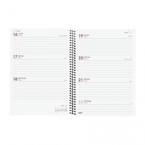 Agenda de espiral de estilo moderno y universal con tapas ligeras de polipropileno. Con goma elástica. Con esquinas microperforadas para localizar rápidamente el día/semana en curso. Agenda con información de interés en la anualidad y otros contenidos extra.
