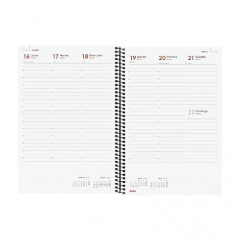 Agenda de espiral de estilo moderno y universal con tapas ligeras de polipropileno. Con goma elástica. Con esquinas microperforadas para localizar rápidamente el día/semana en curso. Agenda con información de interés en la anualidad y otros contenidos extra.
