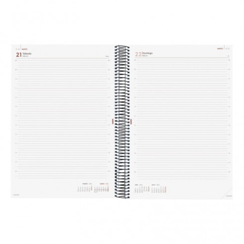 Agenda de espiral de estilo moderno y universal con tapas de polipropileno. Con goma elástica. Con esquinas microperforadas para localizar rápidamente el día/semana en curso. La anualidad contiene la información útil relativa a: onomástica, festivos nacionales, cambios de estación, cambios de hora e inicios del nuevo año chino, musulmán, ortodoxo y hebreo. La agenda incluye otros contenidos extra.