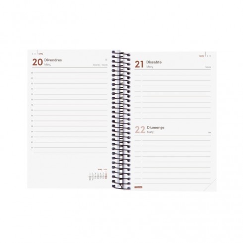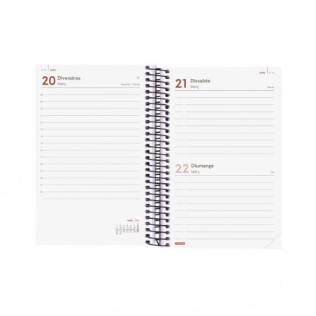 Agenda de espiral de estilo moderno y universal con tapas ligeras de polipropileno. Con goma elástica. Con esquinas microperforadas para localizar rápidamente el día/semana en curso. Agenda con información de interés en la anualidad y otros contenidos extra.