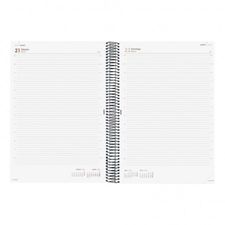 Agenda de espiral de estilo moderno y universal. Con tapa ligera de polipropileno que se puede personalizar: crea y cambia la portada de la agenda a tu gusto. Puedes insertar tu propio dibujo, fotografías, papeles que no puedes perder, etc., o bien también te puedes descargar la portada que desees del apartado DESCARGAS de la web Finocam. En el ámbito profesional permite personalizarla con la imagen o logo de la empresa/negocio. Cierre con goma elástica. Esquinas microperforadas para localizar rápidamente el día/semana en curso. Contiene información de interés en la anualidad y otros contenidos extra. Ideal para tu organización profesional y/o personal.