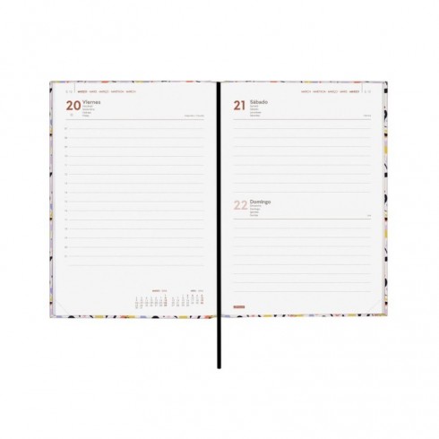 Agenda profesional encuadernada de estilo moderno. Tapa dura de cartón forrado con peliculado mate antirayaduras. Buena apertura. Con cinta-punto. La anualidad contiene la información útil relativa a: onomástica, fases lunares, festivos nacionales, cambios de estación, cambios de hora e inicios del nuevo año chino, musulmán, ortodoxo y hebreo. La agenda incluye otros contenidos extra.