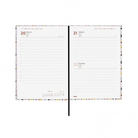 Agenda profesional encuadernada de estilo moderno. Tapa dura de cartón forrado con peliculado mate antirayaduras.