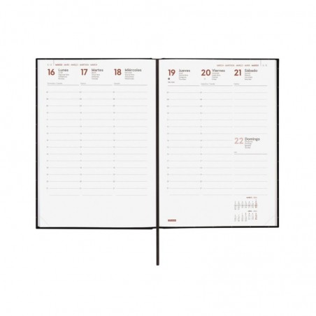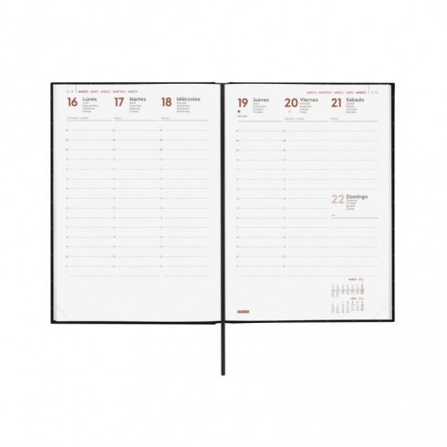 Agenda profesional encuadernada de estilo moderno. Tapa dura de cartón forrado con peliculado mate antirayaduras.