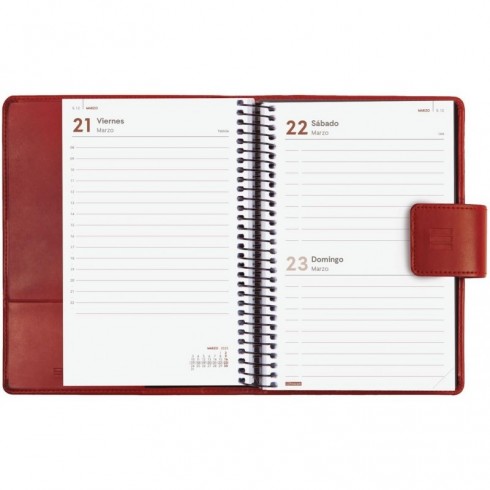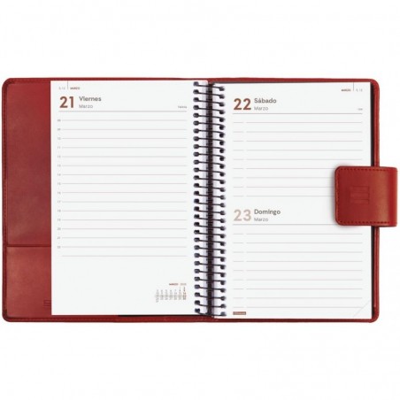 Agenda de espiral con cubierta. Diseño elegante y moderno. Ideal para tu organización profesional y/o personal. Con bolsillo interior y anilla portabolígrafo para tener siempre a mano un elemento de escritura. Equipada con un bloc de notas independiente para disponer siempre de hojas en blanco (también disponible como recambio). Cierre con broche. Esquinas microperforadas para localizar rápidamente el día/semana en curso. Agenda con información de interés en la anualidad y otros contenidos extra. Además, esta agenda te permite conservar la cubierta sustituyendo anualmente solo la agenda de espiral. Si lo deseas, también podrás reutilizar la cubierta como funda de libro o de libreta.