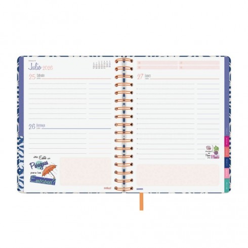 La anualidad contiene: días festivos, cambios de estación y cambios de hora, días muy especiales y curiosos y una frase TALKUAL cada semana. Al inicio de cada mes, la agenda te ofrece el calendario a cuadros para que puedas organizar mejor tus días, así como un contenido temático para darle a tu vida un toque de entretenimiento. El diseño de la agenda es a todo color y las esquinas de las hojas son microperforadas para localizar rápidamente el día/semana en curso. La agenda Talkual también dispone de accesorios vitales para disfrutar organizándote: un set de notas engomadas con diferentes formas, 253 pegatinas temáticas, listas microperforadas para arrancar y una funda decorada ideal para salvaguardar papeles, tarjetas, clips u otros indispensables para llevar contigo. Sin duda, ¡esta es tu agenda! Porque tu singularidad marca la diferencia. Muéstrate #Talkual, #talkualsoy. Somos TALKUAL.estión forestal ambientalmente responsable, socialmente beneficiosa y económicamente viable en los bosques de todo el mundo.