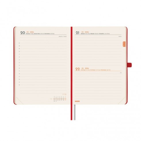 Agenda encuadernada de tapa dura de estilo moderno y universal. Material de tacto gomoso con sensación de textura. Perfecta apertura. Con dos cintas-punto y bolsillo interior con fuelle de papel-tejido muy resistente al uso. Con goma elástica y anilla portabolígrafo para llevar siempre contigo un elemento de escritura. Con esquinas microperforadas para localizar rápidamente el día/semana en curso. Para facilitar la localización de cada mes, la anualidad incorpora un indicador en el lateral derecho de las páginas. La anualidad contiene los festivos nacionales y la onomástica. La agenda incluye otros contenidos extra.