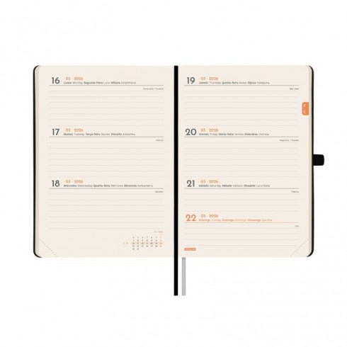Agenda encuadernada de tapa dura de estilo moderno y universal. Material de tacto gomoso con sensación de textura. Perfecta apertura. Con dos cintas-punto y bolsillo interior con fuelle de papel-tejido muy resistente al uso. Con goma elástica y anilla portabolígrafo para llevar siempre contigo un elemento de escritura. Con esquinas microperforadas para localizar rápidamente el día/semana en curso. Para facilitar la localización de cada mes, la anualidad incorpora un indicador en el lateral derecho de las páginas. La anualidad contiene los festivos nacionales y la onomástica. La agenda incluye otros contenidos extra.