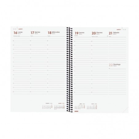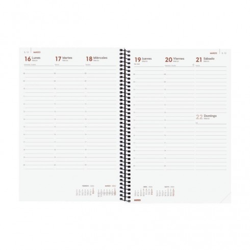 Agenda de espiral de estilo moderno. Con tapas de polipropileno y goma elástica. Ideal para uso personal y/o profesional. Con esquinas microperforadas para localizar rápidamente el día/semana en curso. La anualidad contiene la información útil relativa a: onomástica, festivos nacionales, cambios de estación, cambios de hora e inicios del nuevo año chino, musulmán, ortodoxo y hebreo. La agenda incluye otros contenidos extra.