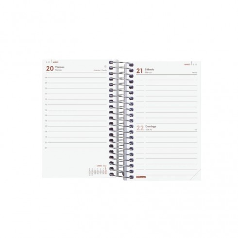 Agenda de espiral de estilo moderno. Con tapas de polipropileno y goma elástica. Ideal para uso personal y/o profesional. Con esquinas microperforadas para localizar rápidamente el día/semana en curso. La anualidad contiene la información útil relativa a: onomástica, festivos nacionales, cambios de estación, cambios de hora e inicios del nuevo año chino, musulmán, ortodoxo y hebreo. La agenda incluye otros contenidos extra.