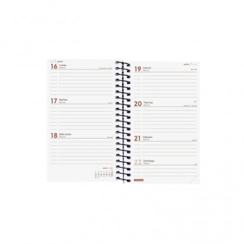 Agenda de espiral de estilo moderno. Con tapas de polipropileno y goma elástica. Formato ideal para llevar en el bolso.