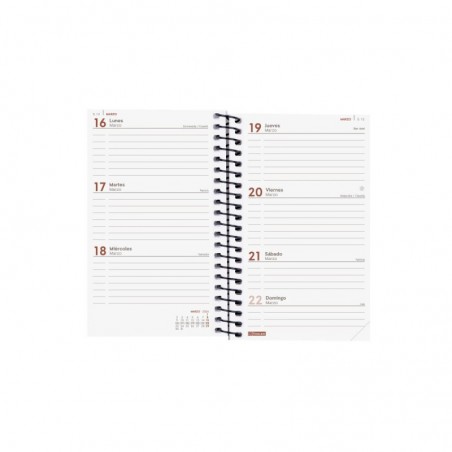 Agenda de espiral de estilo moderno. Con tapas de polipropileno y goma elástica. Ideal para uso personal y/o profesional. Con esquinas microperforadas para localizar rápidamente el día/semana en curso. La anualidad contiene la información útil relativa a: onomástica, festivos nacionales, cambios de estación, cambios de hora e inicios del nuevo año chino, musulmán, ortodoxo y hebreo. La agenda incluye otros contenidos extra.